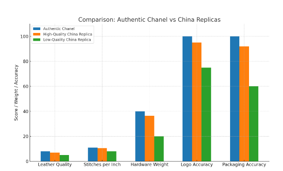 - Data: Original Chanel hardware weighs 30–50 grams per clasp, with a solid feel. Top-tier Chinese replicas weigh around 28–45 grams, whereas budget versions can be 15–25 grams, often hollow.